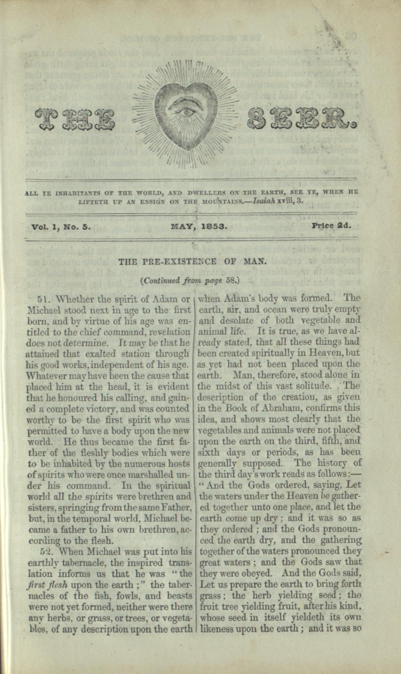 Orson Pratt, "The Pre-Existence of Man," The Seer 1, no. 5 (May 1853): 65–73