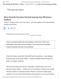 Peggy Fletcher Stack, "How beards became barred among top Mormon leaders," The Salt Lake Tribune, April 5, 2013
