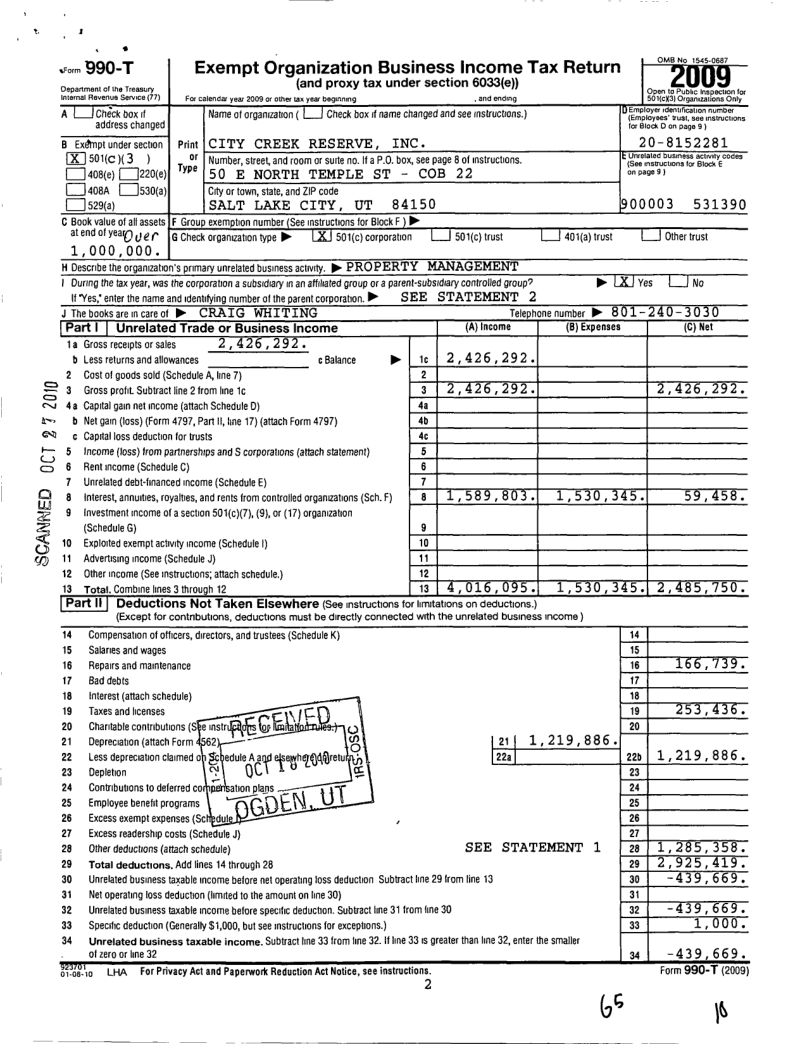 2009 "Form 990-T Exempt Organization Business Income Tax Return" for City Creek Reserve, Inc.