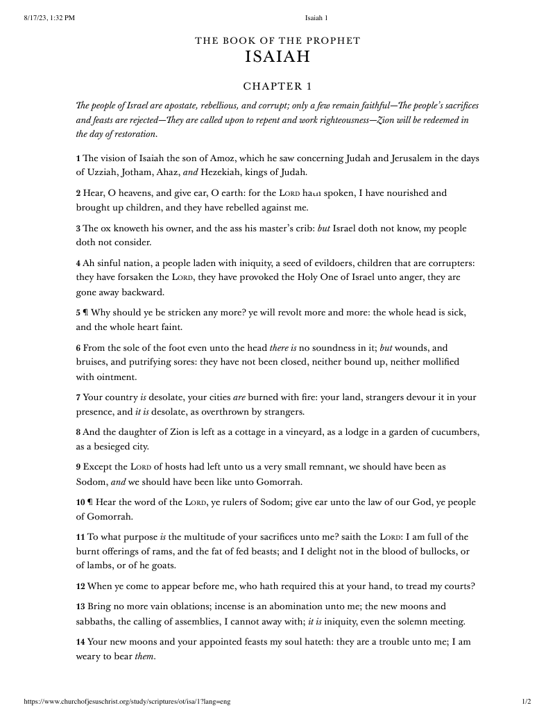 Isaiah 1, Old Testament, The Church of Jesus Christ of Latter-day Saints, accessed August 17, 2023