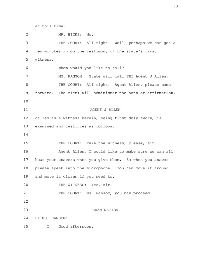 [Portion of The State of Arizona vs. Leizza Adams, CR20170042 transcript containing Agent J Allen testimony.]